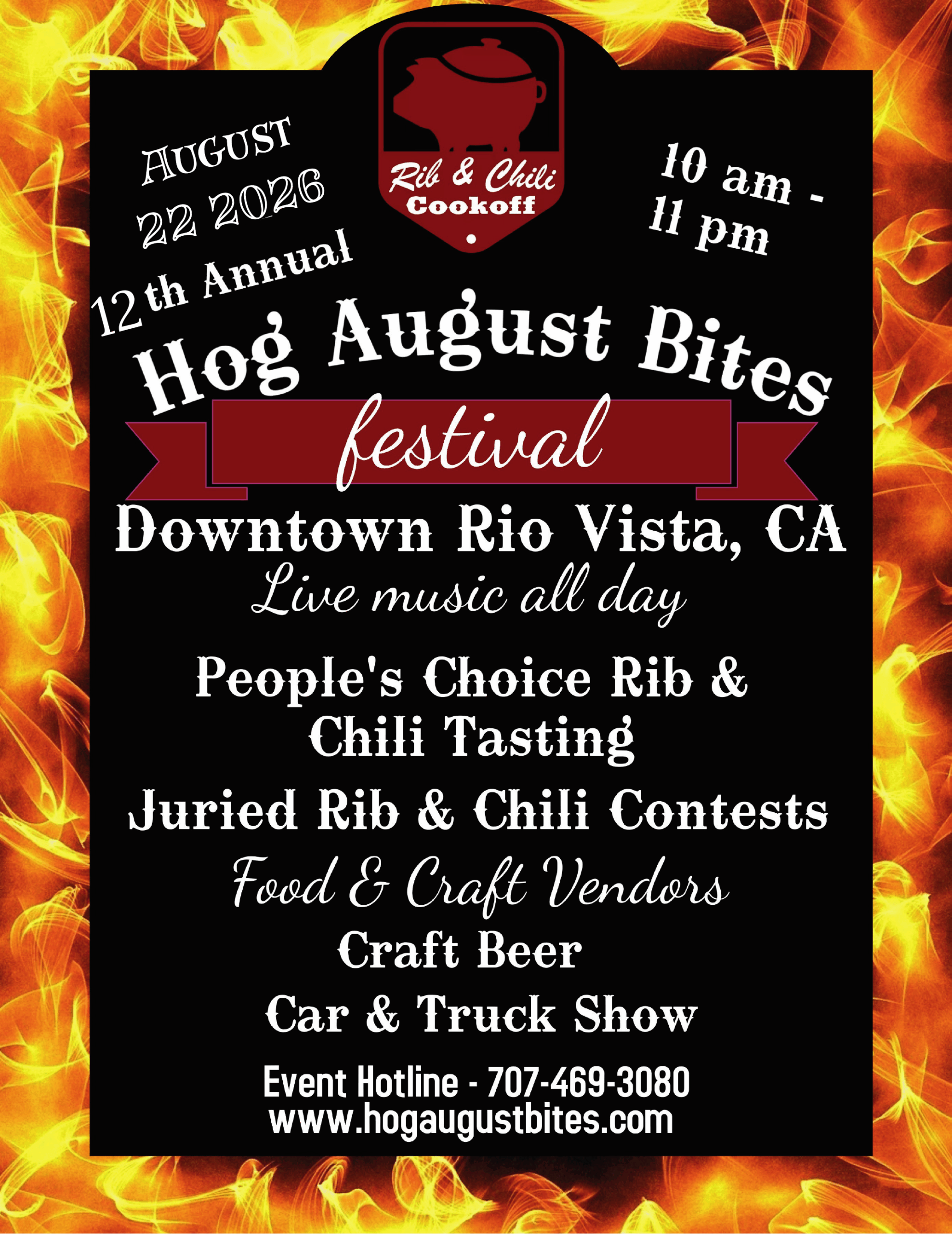 12th Annual Hog August Bites August 22, 2026 Presented by RioVision & the City of Rio Vista Hog August Bites 2025 Secure your spot at the 11th Annual Hog August Bites Rib & Chili Cook-off! Volunteers can sign up early for your favorite positions. Applications for the rib and chili cookoff, vendors, food vendors, and car show are available on the Application Forms page https://hogaugustbites.com/hab2025/. Interested in sponsoring the event? Net proceeds benefit various youth groups. Contact us at [email protected] or call 707-469-3080 for more information.